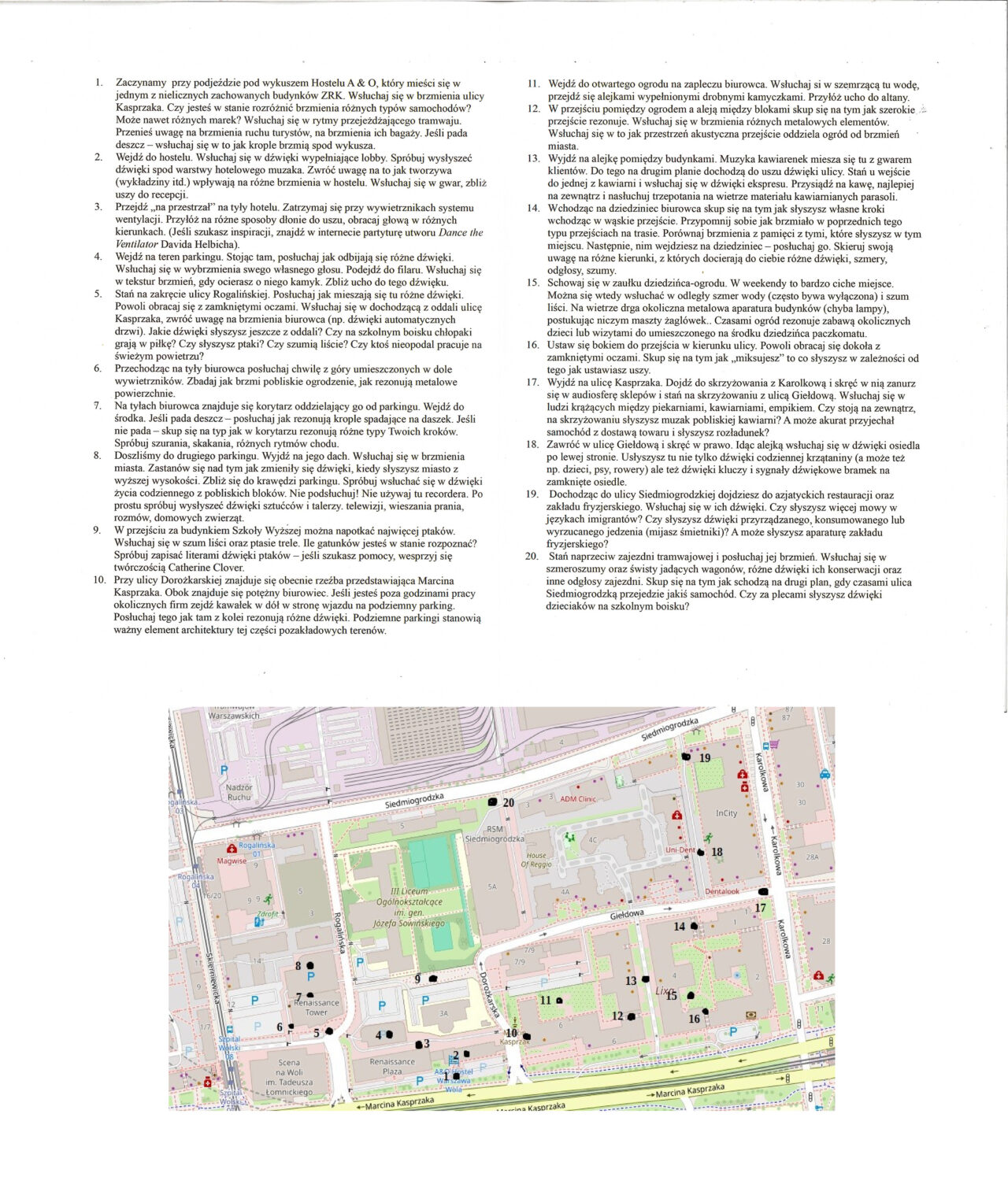 Jak nazywam poszczególne dźwięki? Czy umiem je od siebie oddzielić albo połączyć? Czy otaczające mnie brzmienia wywołują skojarzenia – są przyjemne czy nieprzyjemne? Czy jest w tym pejzażu coś, co chciałabym / chciałbym zmienić? A może przypomina mi coś z przeszłości?
